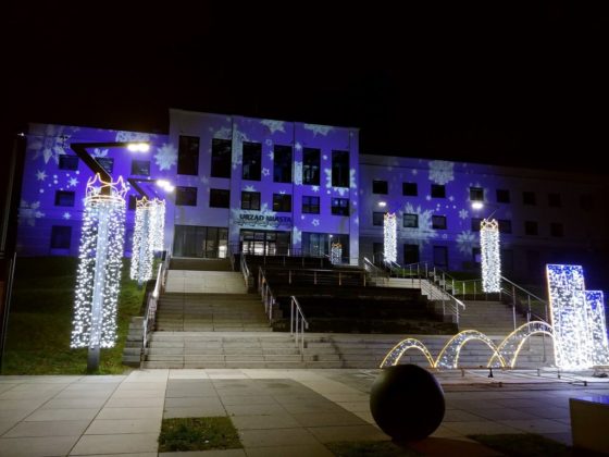Świetlne dekoracje zawisły też na drzewach i latarniach znajdujących się przy głównych ciągach komunikacyjnych. Efektownie prezentuje się również przystrojony Plac Konstytucji 3 Maja. Po zmroku rozbłyskują gwiazdki na elewacji budynku Urzędu Miasta.